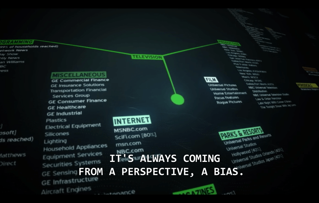 Media can overlook, exploit, or undermine facts. The majority of media is derived from one  conglomerate bias, one perspective.  The facts become a fiction, a fabrication of the inarguable, concrete evidence of what is happening off screen, on the street. For example, we can read about carnage in the middle east, but it won’t be on TV.  The American media has filters. Filters not only dictate what we see but shape what we want to see. The medium–TV shows, news stations, movies–is the biased message.